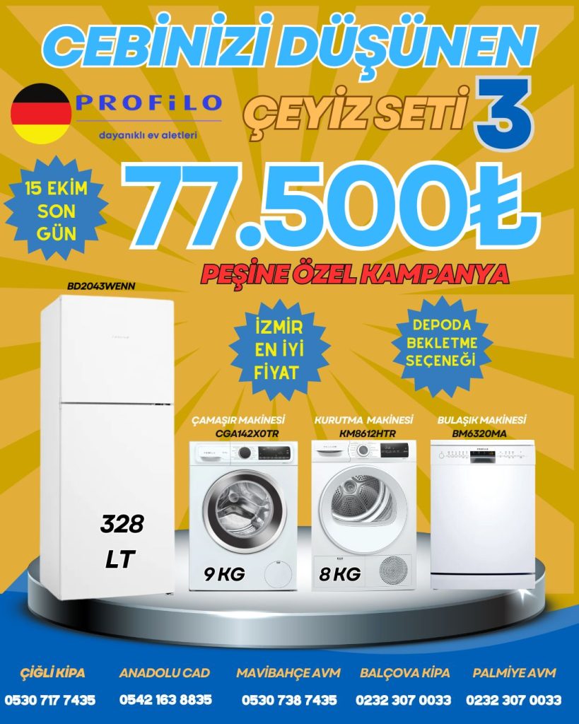 Profilo’nun dayanıklı ve enerji tasarruflu ürünleri, modern teknolojiyle evinizi güzelleştiriyor. Örneğin, Karşıyaka’da yeni bir buzdolabı mı arıyorsunuz? Profilo’nun geniş hacimli, A+++ enerji sınıfı modelleri tam size göre! Çiğli’de çamaşır makinesi mi lazım? Sessiz çalışan, yüksek kapasiteli makinelerimizle tanışın. Mağazamızda her ürüne özel kampanyalar ve taksit seçenekleri sunuyoruz.